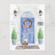 Anuncie su nueva dirección con nuestra elegante invitación con un gato siberiano, puerta delantera azul, alfombra de bienvenida, topiarios y una corona floral sobre un fondo de ladrillo gris.
