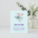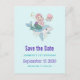 Guarda la postal de fecha cumpleaños / evento con un adorable ilustracion. Diseñado con un chica de sirena de bonito montando un delfín feliz. Un pequeño amigo de medusas los acompaña. Decorada con pequeñas manchas de purpurina de oro falso. Fondo azul claro.