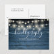 Una tarjeta de RSVP rústica con bonitas luces de cuerda y tipografía chic sobre un fondo de paneles de madera azul. El reverso incluye tus datos y una divertida solicitud de canción para invitados. Diseñado por Thisisnotme