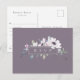Elegante marco plateado, flores de acuarela en tonos bonitos de verde, violeta, blanco y rosa, tarjeta postal de confirmación de asistencia a la boda con solicitud de canción. Personalizar texto, personalizar estilo de fuente, color y tamaño. El color de fondo, que se muestra en violeta polvoriento, se puede personalizar.