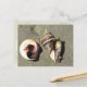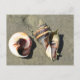 Postal fotográfica de conchas marinas en blanco con la foto de un concha de la corona y la concha ocular del tiburón. Ambas cáscaras son punteadas para mostrar la apertura (apertura) y los puntos de la corona son claramente visibles. Ambas conchas están tiradas en la arena de la playa. Revertir está en blanco y las tarjetas se pueden usar en cualquier ocasión.