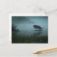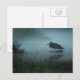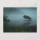 Esta tarjeta posteada muestra una foto de una Gran Garza Azul, pescando en un estanque en la niebla matutina.