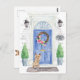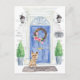 Anuncie su nueva dirección con nuestra elegante invitación con un Yorkshire Terrier, puerta delantera azul, alfombra de bienvenida, letrero de pizarra, topiarios y una corona floral sobre un fondo de ladrillo gris.