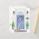 Anuncie su nueva dirección con nuestra elegante invitación con un gato de Ragamuffin, puerta delantera azul, alfombra de bienvenida, letrero de pizarra, topiarios y una corona floral sobre un fondo de ladrillo gris.