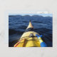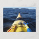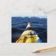 Fotografía de la proa de un kayak amarillo en un lago con montañas al frente. Texto personalizable, "Kayak" impreso en la esquina superior izquierda.