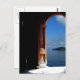 Una vista surrealista de las islas del Pacífico tropical y el agua azul a través de una improbable puerta.