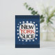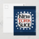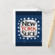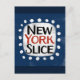 Un divertido y lindo diseño de mensajes tipográficos que dice "New York Slice". Tiene texto en negro y rojo sobre un rectángulo blanco con puntos blancos divertidos y juguetones rodeándolo, todo sobre un fondo azul.