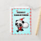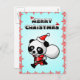 Un oso de panda lindo del dibujo animado que lleva un gorra de Santa y el paño de Santa y un bolso por completo de regalos de Navidad le desean Felices Navidad.