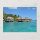 Postal con lujosos bungalows con techo de paja en un complejo de Moorea, una isla cerca de Tahití en la Polinesia Francesa.