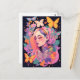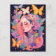 Una hermosa postal con un sereno retrato de una mujer rodeada de coloridas mariposas y flores vibrantes, ideal para enviar un toque de elegancia y de fantasía.