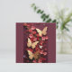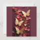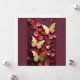 Una escena vibrante con mariposas doradas de diseño intrincado posicionada entre flores rojas y exuberantes. Las mariposas, con sus alas detalladas, parecen revolotear en medio de la disposición floral.