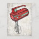 El Electric Hand Mixer cuenta con una mezcladora de cocina vintage de color rojo con un guarnecido blanco, acuático y negro sobre un fondo blanco angustiado.