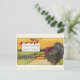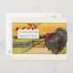 Diseñado por Susan Epps Oliver. Imagen vintage de Acción de Gracias de un pavo en un campo con un paisaje agrícola detrás de él. Una rama de hojas rojas de otoño sostiene el mensaje "Saludos de Acción de Gracias"