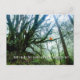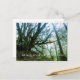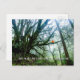 Grandes árboles, asombrosa postal de aventura con mensaje personalizado del profesor. Bienvenidos a clase este año escolar enviando correos. Esta tiene una foto de grandes ramas de árboles en un bosque con una sola persona sentada en una extremidad.