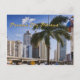 Vista de los edificios de departamentos de la ciudad de Panamá, con un puente, tráfico y una palmera en primer plano.