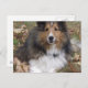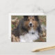 Perro collie con pelo largo, descansando en un montón de hojas de otoño.