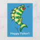 Un pez que salta de color verde y amarillo con una gran boca roja, un divertido dibujo de Ans Collijn © Guay postcard para desear a alguien Feliz Pescador!
