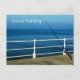 Fotografía de un palo de pesca inclinado sobre el barandilla en el muelle de pesca. Personalizable.