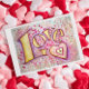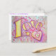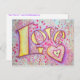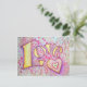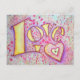Pintura acuarela de la palabra amarilla dorada "Amor" con doble corazón. El rosa y el morado resaltan las letras y el corazón. Una ligera salpicadura de purpurina en la parte superior del cuadro le da un resplandor brillante. Personaliza esta postal de arte de palabras de amor con tu propio texto e imágenes usando el botón "Personalizar". ¡Haz tus mensajes de notas de amor, postales o invitaciones!