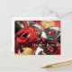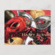 Una postal colorida con máscaras Purim y Hamantaschen, ideal para incluir con su Shalach Manot.