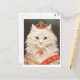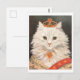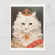 Esta es una reproducción de una postal vintage que muestra a un gato blanco vestido de reina.