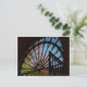 Postal con vista al cielo azul y a la flor de los árboles de flores rosadas a través de un arco decorativo de hierro en Sevilla.