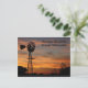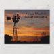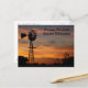 Una silueta de Windmill de Kansas que está en una postal. Con una silueta de molino de viento, árboles, nubes, cielo azul y nubes naranjas. Eso está fuera en el campo.