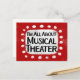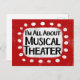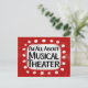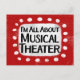 "I'm All About Musical Theater" es un lindo diseño de texto en rojo con texto negro, junto con una forma de acento blanco y puntos caprichosos de textura blanca que lo rodean.