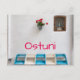 Postal de un santuario o altar de la calle con una pequeña estatua de la virgen María, flores y un banco azul y blanco en la ciudad blanca Ostuni en Puglia, Italia con el texto: 'Ostuni'.
