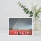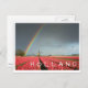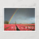 Postal de un arcoíris colorido en un cielo oscuro sobre un molino de viento y un campo lleno de tulipanes rojos brillantes durante una tormenta de primavera en un paisaje cerca de Amsterdam en los Países Bajos con un borde blanco y el texto: 'Holanda'.