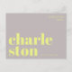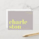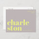 Envía un saludo elegante y contemporáneo desde Charleston, Carolina del Sur, con esta tarjeta postal tipográfica moderna. Con la palabra Charleston dividida en dos líneas en letras minúsculas decorativas y en negrita en amarillo brillante sobre un fondo gris suave, este diseño es minimalista y llamativo. La frase "greetings from" aparece arriba en una fuente sans serif delgada y elegante, lo que añade un toque moderno y sofisticado. Perfecta como recuerdo de viaje, pieza decorativa o forma única de enviar amor desde tu ciudad favorita. Ideal para fanáticos del diseño contemporáneo, la tipografía y el espíritu aventurero.