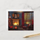 Un acogedor rincón de lectura en un día lluvioso de otoño. Alrededor de la chimenea hay unos sillones rojos mullidos, con pilas de libros y tartas y una tetera para completar el confort. En el exterior, un sauce amarillo y una cubierta roja de arce y hayas se ven oscurecidos por la lluvia que sopla la ventana, donde un gato jengibre se sienta mirando hacia afuera.