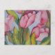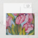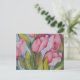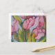 En esta postal se han colocado bonitos tulipanes rosados y hojas verdes, a partir de una pintura acuarela original.