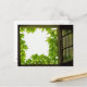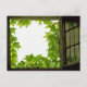 Antigua ventana oscura enmarcada por hojas de uvas verdes