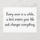 Se dice que "Una vez el dueño de un pájaro, siempre el dueño de un pájaro" porque tu primer pájaro mascota cambia todo. Ahora puedes celebrar a los pájaros en tu vida con un "De vez en cuando, un pájaro entra en tu vida y cambia todo". postcard y mostrar que es verdad y que estás orgulloso de tus pájaros.