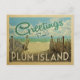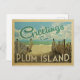 El diseño de esta postal antigua de Greetings From Plum Island incluye una playa de arena con un hermoso agua turquesa del océano y sobre el mar, un cielo azul con nubes blancas onduladas. En estilo de viajes vintage.