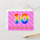 El frente de este diseño de tarjeta postal con tema de cumpleaños alegre y feliz presenta un número grande "10" con un patrón de gradiente de espectro de arcoíris. También presenta el mensaje "Feliz cumpleaños 10º", y un nombre de destinatario personalizable. La parte delantera también tiene un patrón alegre a rayas de color rosa oscuro y rosa claro con formas de corazón. La parte trasera presenta un mensaje de saludo de cumpleaños personalizado, o quizás podría estar en blanco si se desea escribir un mensaje a mano. Una tarjeta postal de cumpleaños personalizada como esta podría ser una forma divertida de celebrar el décimo cumpleaños de alguien. Tarjetas postales como esta también podrían usarse para invitar a invitados a una celebración de cumpleaños que se celebra para alguien que cumple 10 años.