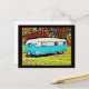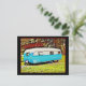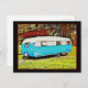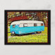 RV de antaño. La caravana retro es azul y blanca. Está rodeada de césped verde y vívido y un pequeño bosque es el telón de fondo. Esta fotografía es pura nostalgia.