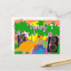 Postal del dinosaurio de DJ del fiesta. Gafas de sol que llevan del dibujo animado de DJ de un Diplodocus fresco del dinosaurio que juegan música en un fiesta maravilloso en una ubicación tropical con palmeras y un sol amarillo grande en la puesta del sol con el texto adaptable "fiesta!". Esta postal fresca del fiesta del feliz cumpleaños es completamente adaptable, añade sus textos e imágenes. ¡Una postal animal del dibujo animado colorido del fiesta para las fans grandes y/o pequeñas del dinosaurio!