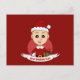 Postal con el ilustracion de un lindo sonriente y feliz muchacho de pelo rubio, lleva disfraz rojo y blanco de Santa Claus y tiene un regalo; con plantilla de texto editable para tu nombre o mensaje, Navidades diseño de vacaciones con fondo rojo