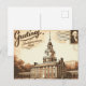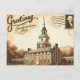 Transportate al pasado con nuestra postal de estilo vintage con Independence Hall en Filadelfia, Pensilvania. Este ilustracion de color sepia capta la belleza intemporal de este hito histórico, mostrando su intrincada arquitectura e importancia en la historia estadounidense. Los bordes agobiados y la textura desgastada evocan la nostalgia, mientras que el mensaje de "Saludos desde el Salón de la Independencia", con un tipo de letra cursiva clásica, añade su encanto antiguo. Un perfecto regalo o regalo para los amantes de la historia y para los viajeros.
