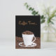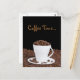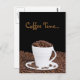 Esta postal del tiempo del café ofrece los granos de café recientemente asados que rodean y que llenan una taza del café con leche que se sienta en un platillo blanco. Un fondo negro proporciona el lugar perfecto para las palabras "tiempo del café…". Este texto se modifica para requisitos particulares fácilmente usando la plantilla proporcionada. Esta postal sería grande enviar a un amigo o utilizar para hacer publicidad de su cafetería o café.