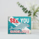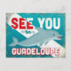 Te veo en Guadalupe Diseño de viaje retro del delfín del Caribe. Encantador estilo vintage turquesa con un delfín nadando alegre.