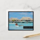 Postal de dos hombres en una canoa de gatillo que lleva el servicio de desayuno al estilo polinesio a los clientes de luna de miel en un lujoso complejo sobre el agua en la isla tropical de Bora Bora, Polinesia Francesa con borde negro y texto: 'Bora Bora'.