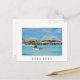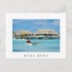 Postal de dos hombres en una canoa de gatillo que lleva el servicio de desayuno al estilo polinesio a los clientes de luna de miel en un lujoso complejo sobre el agua en la isla tropical de Bora Bora, Polinesia Francesa con un borde blanco y el texto: 'Bora Bora'.