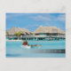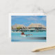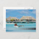 Postal de dos hombres en una canoa de gatillo que lleva el servicio de desayuno al estilo polinesio a los clientes de luna de miel en un lujoso complejo sobre el agua en la isla tropical de Bora Bora, Polinesia Francesa con un bar que se desvanece y el texto: Bora Bora.
