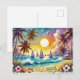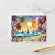Aquí hay una postal de viaje de color agua realzada con una playa tropical con múltiples veleros, palmeras altas y olas suaves, pintadas con brochas fluidas. 🌴 ⛵ 🌞 El cielo está adornado con vivos tonos naranja, rosa y morado, creando una puesta de sol de ensueño. El texto "¡Descubre el paraíso!" está en un guión elegante y fluido con una textura acuarela. 🌺 La escena incluye ahora un bar junto a la playa con antorchas de tiki, flores de hibisco de colores y conchas de conchas esparcidas a lo largo de la orilla