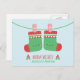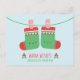 Un lindo par de calcetines de invierno de color verde y rojo están colgados en una línea verde con pegamento rosa. El texto correspondiente dice "¡Deseos cálidos!", que es perfecto para las vacaciones de los Navidades. Decorado con mistletoe.