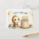 Esta encantadora tarjeta de cumpleaños aporta un toque "Bee-lightful" a cualquier celebración. Presenta a un adorable personaje de abeja con ojos grandes y brillantes y una suave sonrisa, adornada con una corona floral. La abeja está haciendo un deseo, sentada junto a una vibrante tarta de cumpleaños de colores pastel con velas encendidas listas para ser apagadas. Un pequeño pastelito con lazo rosa y un regalo bien envuelto añaden ambiente festivo. El fondo está lleno de confeti suave y salpicaduras de acuarela, creando una escena caprichosa y emotiva que es perfecta para enviar deseos de feliz cumpleaños a alguien especial.