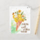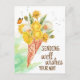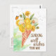 Plantilla de tarjeta postal de diente de león deseando pensando en ti. Ramo de dientes de león florecidos, dientes de león en flor, una pequeña mariposa en un cono de helado de barquillo.